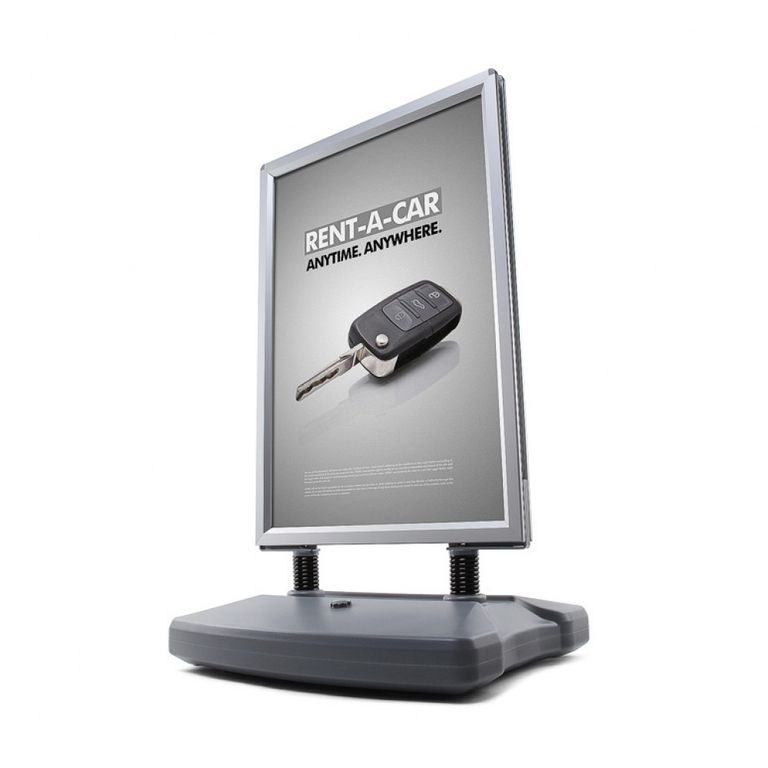 Speziell für Ihre Werbung in windigen Bereichen ist der Kundenstopper WINDTALKER® von Planauftritt Werbetechnik in Braunschweig, Hannover, Celle, Soltau und Hamburg die optimale Lösung. Sein mit Wasser oder Sand befüllbarer Standfuß bietet in Verbindung mit den Spezialfedern aus Stahl eine hohe Standfestigkeit. Für den einfachen Transport sind im Standfuß Rollen integriert. So können Sie den Kundenstopper trotz des Standgewichtes einfach bewegen. Der Aluminium-Schnellwechselrahmen kann doppelseitig mit Plakaten bestückt werden und garantiert Ihnen auch bei hohen Windstärken eine auffällige Werbemöglichkeit.
