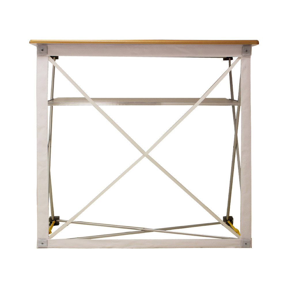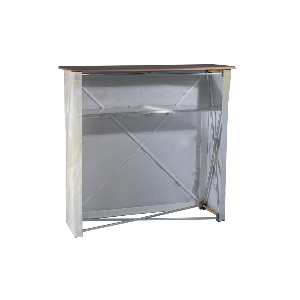 Die Textilfalttheke ist eine strapazierfähige und leichte Lösung, die sich schnell und einfach montieren lässt. Mit einer einzigen, umlaufenden Stoffgrafik, die auch beim Zusammenklappen und Wegpacken auf dem System verbleiben kann, bietet diese Theke eine nahtlose und attraktive Präsentationsfläche.