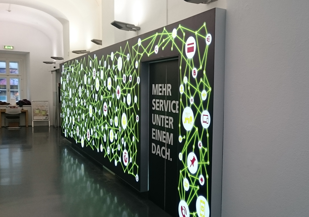 Der MULTIframe SIDELIGHT von Planauftritt Werbetechnik ist ein vollflächig hinterleuchteter LED Rahmen mit einer Bautiefe von nur 12 cm. Das einseitig verwendbare Aluminiumrahmenprofil eignet sich hervorragend für die Wandmontage. Durch die spezielle Linsenform der LED Module kann man trotz der schmalen Bautiefe keinerlei Lichtpunktbildung auf der Stoffoberfläche entdecken – das Motiv wird einheitlich und schattenfrei dargestellt. Die Stoffgrafiken sind mit Gummilippen versehen, die ihnen einen perfekten Halt im Rahmensystem ohne Falten geben. Darüber hinaus ist mit diesem System ein einfacher und rascher Grafikwechsel möglich. Nicht nur die Leuchtkraft von ca. 5000 lm, sondern auch die homogene Ausleuchtung machen den MULTIframe SIDELIGHT zu einem Leuchtrahmen, der alle ähnlichen Produkte in den Schatten stellt. Alle Systemteile sind auch als Einzelteile erhältlich.